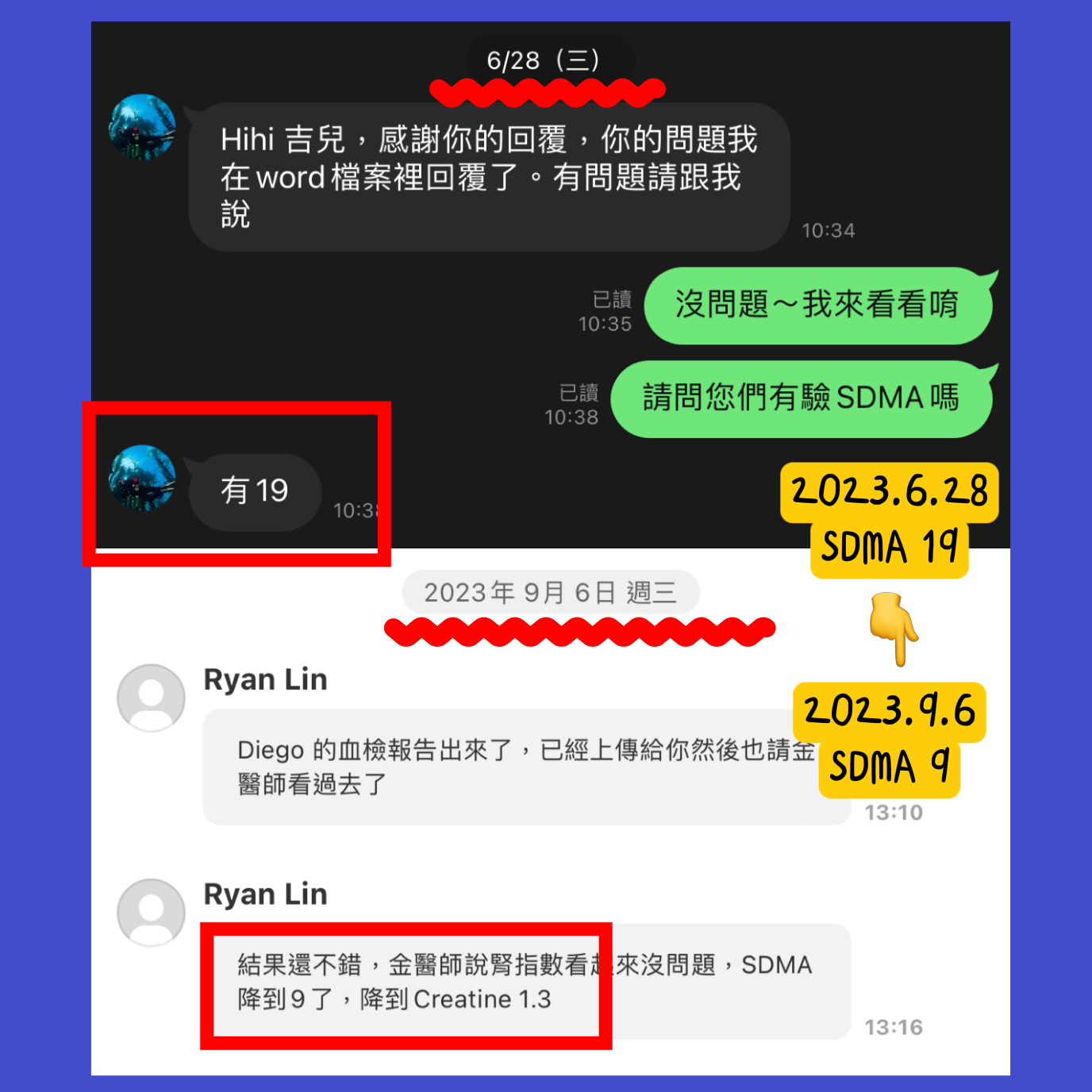 Diego當時很害怕看醫生,因此Ryan也非常認真跟我討論零恐懼就醫的減壓訓練,包括外出籠訓練、放鬆藥物的正確用法、實際到了醫院如何減壓…等等。三個月後,他順利帶Diego回診追蹤,我們發現:這段時間只是增加濕食搭配普通乾飼料,Diego的腎指數就順利恢復正常值了!血檢報告出來後,Ryan還跟台灣醫生約了第二意見諮詢,證實我們的調整方向很適合Diego,大家都鬆了一口氣!